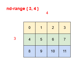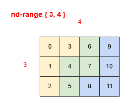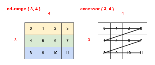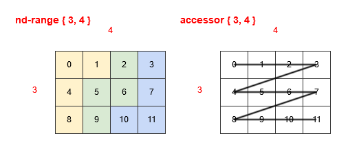 When the nd_range is multi-dimensional things are different. Describing the mapping of indexes in a multi-dimensional nd_range iteration space into a linear iteration space that maps to consecutive processing elements can be described as iteration space linearization, and there are generally two ways in which this can be done by a SYCL implementation. These are often referred to as row-major and column-major, so named because the contiguous indexes once moved to a linear iteration space are along the same row and column in the multi-dimensional space respectively.